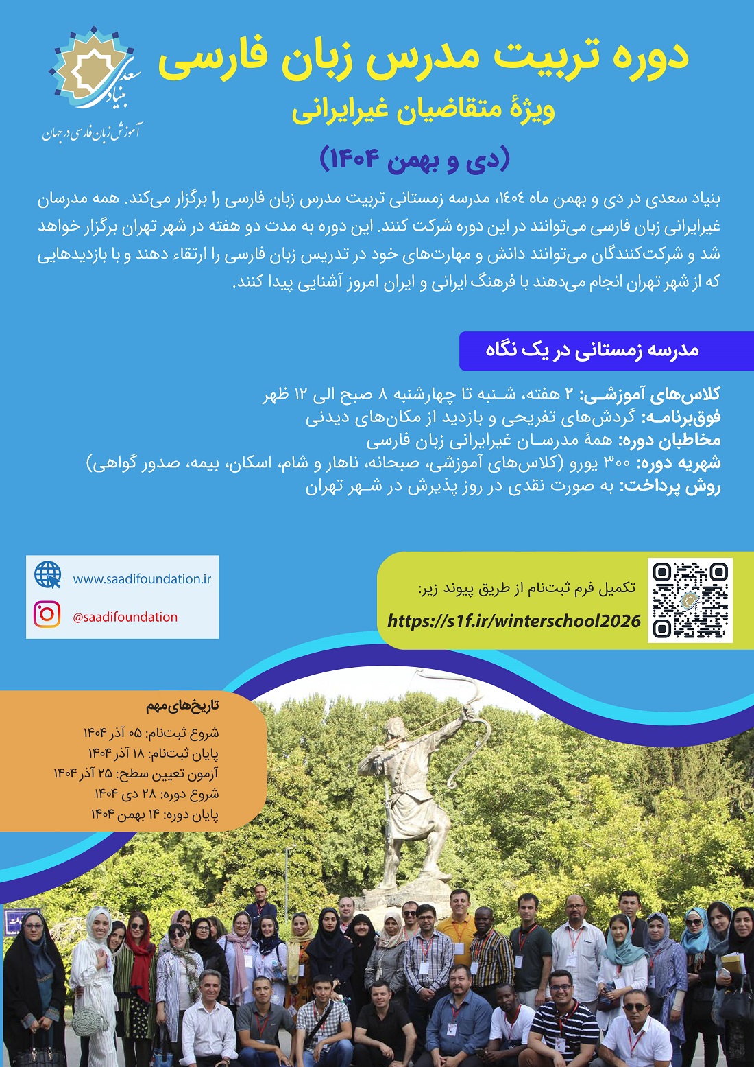 اطلاعیه بنیاد سعدی دربارۀ فراخوانهای مدرسۀ زمستانی 1404 زبان فارسی (علاقهمندان زبان فارسی و مربیان غیرایرانی زبان فارسی)